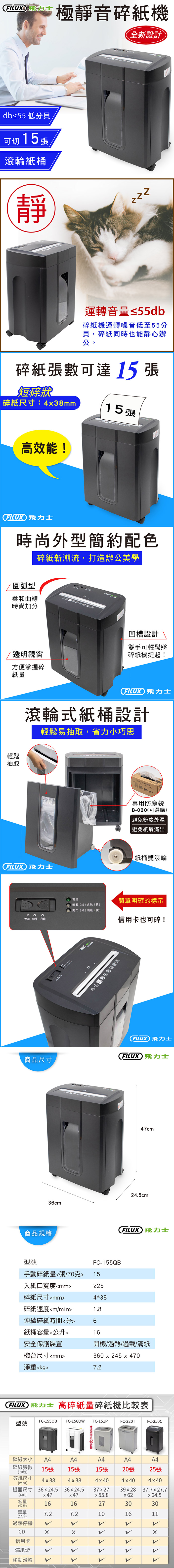 FILUX 飛力士 15張超靜音短碎狀碎紙機(16公升) 黑金 FC-155QB