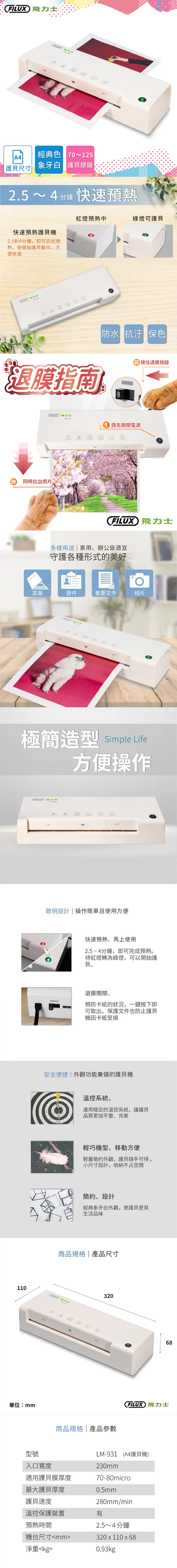 FILUX 飛力士 LM-931 A4 專業護貝機 象牙白