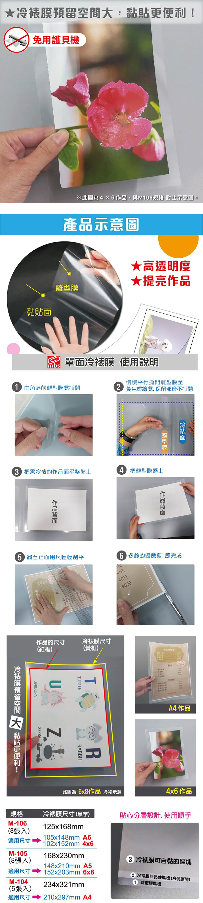 MBS萬事捷 M-105 免用護貝機 單面冷裱護貝自黏膠膜 冷表膜 保護貼 A5 / 厚度100μ / 1包8張