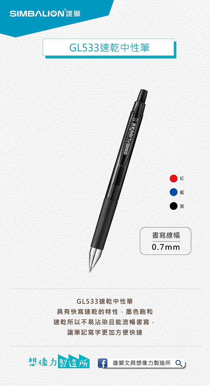 SIMBALION 雄獅 GL-533 藍色 0.7 速乾自動中性筆 1支