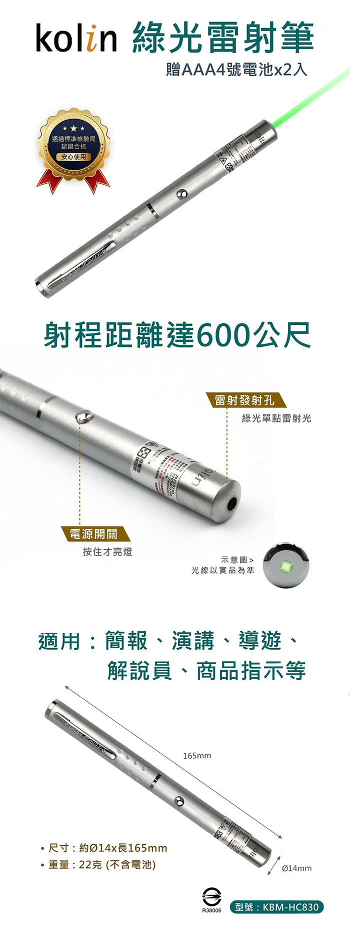 KOLIN歌林 KBM-HC830 綠光單點 雷射簡報筆 筆夾式雷射指示筆 雷射筆 銀色 1支