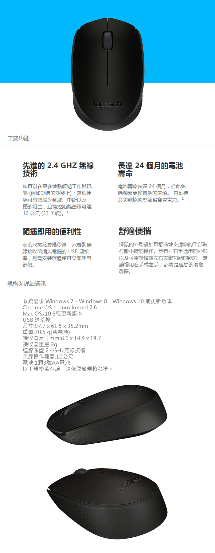 Logitech 羅技 B170無線滑鼠(USB接收器)