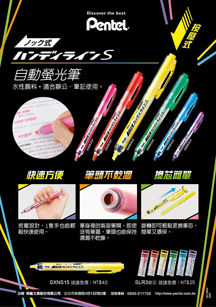 ✔按壓式自動螢光筆,收起時內有黑色密閉塑膠蓋,防止螢光液體蒸發