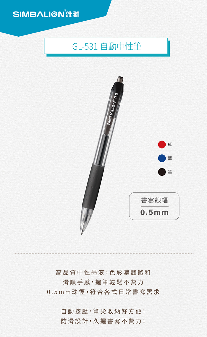 • SIMBALION 雄獅 GL-531 藍色 0.5 自動中性筆 1支
