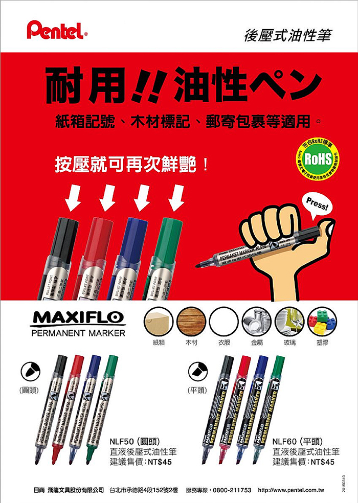 ✔ 特色:後壓式筆管設計,按壓後鍵即可補充筆頭墨水,不受書寫姿勢影響,可隨時保持墨水流暢,色澤鮮艷