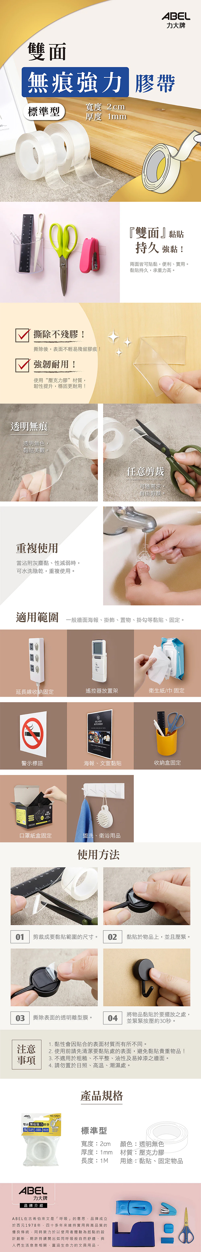 • ABEL力大牌 12521 透明無痕 強力雙面膠帶(標準型/厚1mm)2cm*1M (卷)
