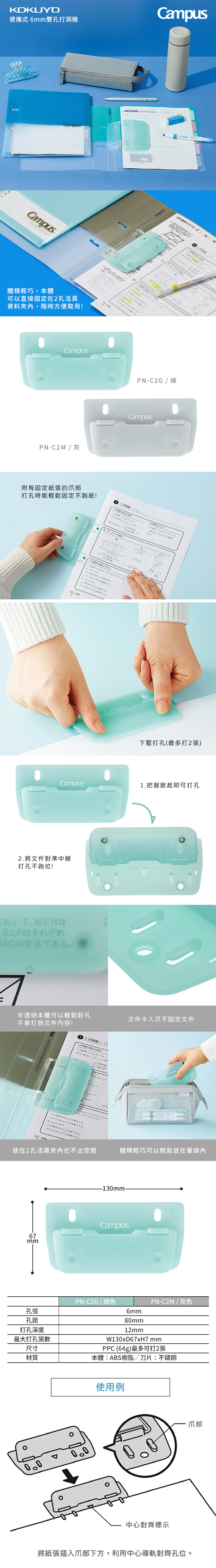 【日本文具】K0KUYO Campus PN-C2G 便攜式 6mm 雙孔打孔機 2孔打孔器 打洞機 打洞器 綠色