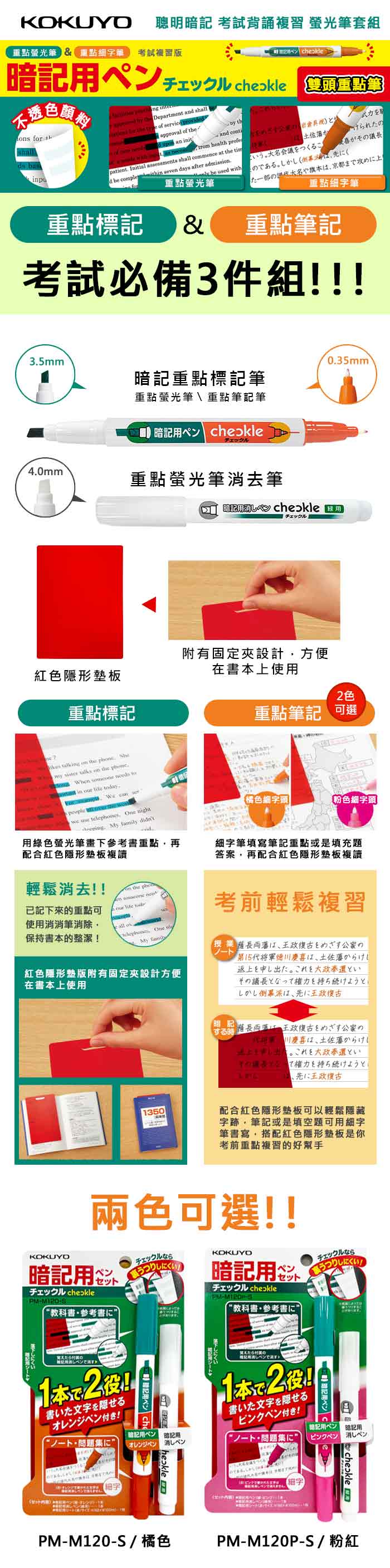【日本文具】KOKUYO國譽 KOPM-M120-S 學霸聰明暗記螢光筆套組(雙頭暗記螢光筆+消去筆+遮擋板)-綠+橘